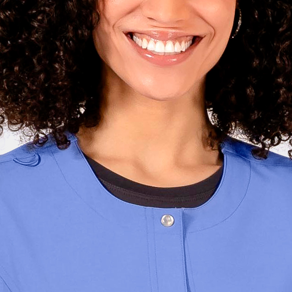 Experience the allure of our Women’s Snap Jacket. With a classic round neck, pearl snap accents, and a tailored bungee loop, it seamlessly blends style with utility. Micro-knit cuffs ensure a flawless fit, while pockets guard your essentials. Designed for the diligent healthcare warrior.
