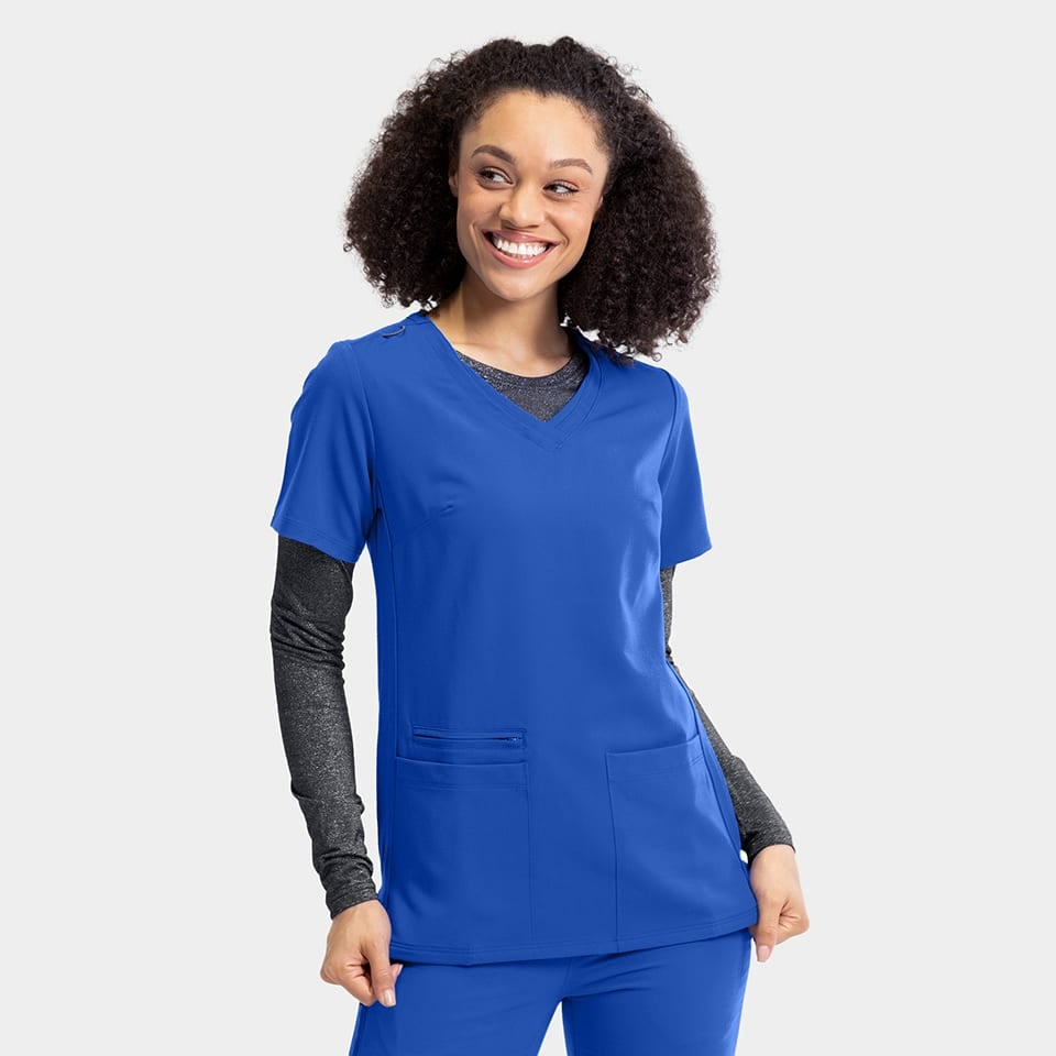 Experience comfort and confidence with the Women?s Sporty Solid Double V-Neck Top. Lightweight and breathable, it’s perfect for our healthcare warriors on the move. Featuring two pockets, a chic bungee loop, and shaping seams, it’s the blend of fashion and function you’ve been seeking.